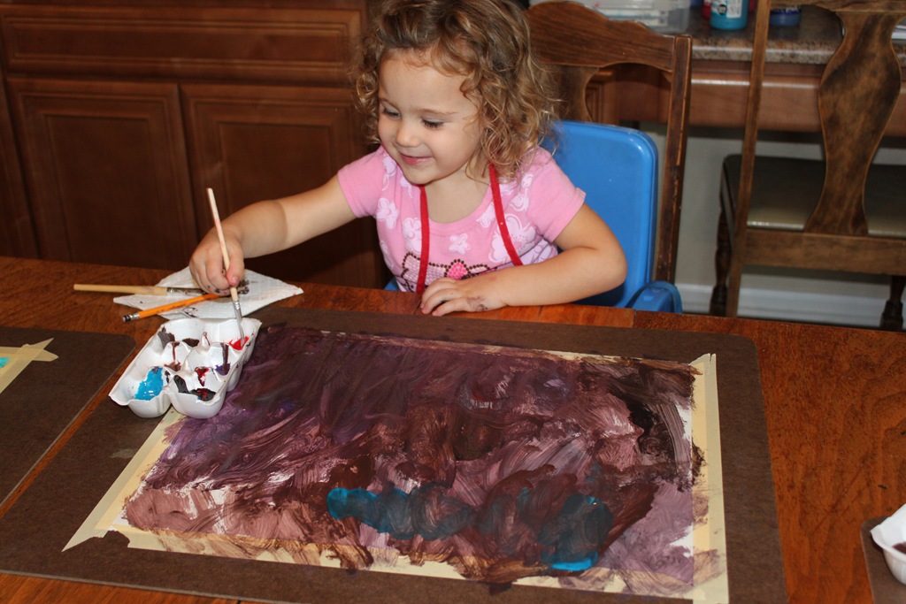 I’m not sure exactly which style the Teeny Tot was going for here, but she definitely had a great time. She went through several sheets of paper. She seems conflicted though, her painting is quite dark and dreary, while her face has a lovely smile on it…darn artists, you can never tell with them.