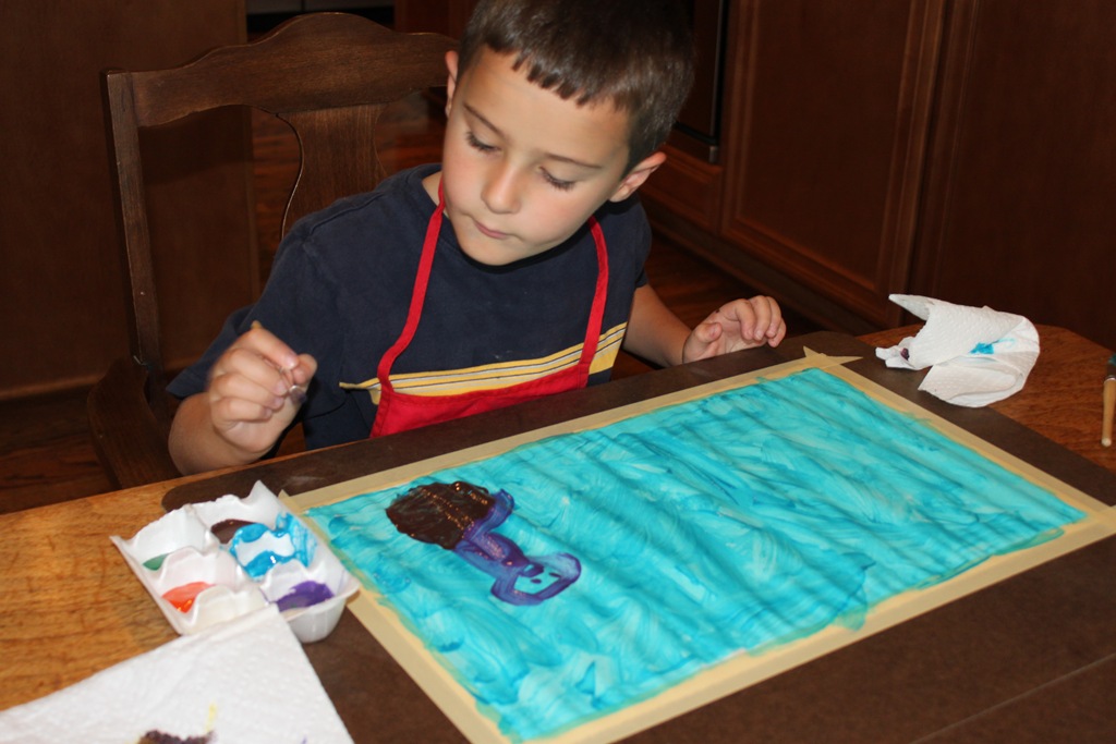 Later in the lesson we took a shot at imitating one of Picasso’s paintings. The kids chose “Boy with Sailor Suit and Butterfly Net” (1938).