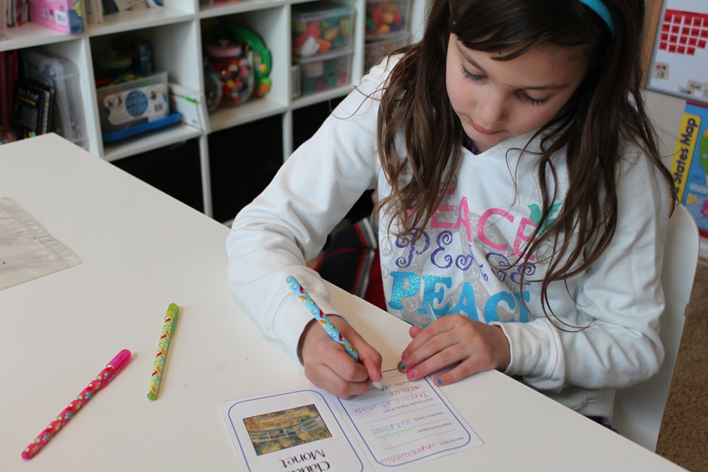 Strawberry Shortcake has been “deemed” official writer of artist flashcards it seems. She has the best handwriting and we’re actually doing one artist lap book, so they all share in putting it together. Looking back I probably should have let them each do their own lap book, and maybe I still will.