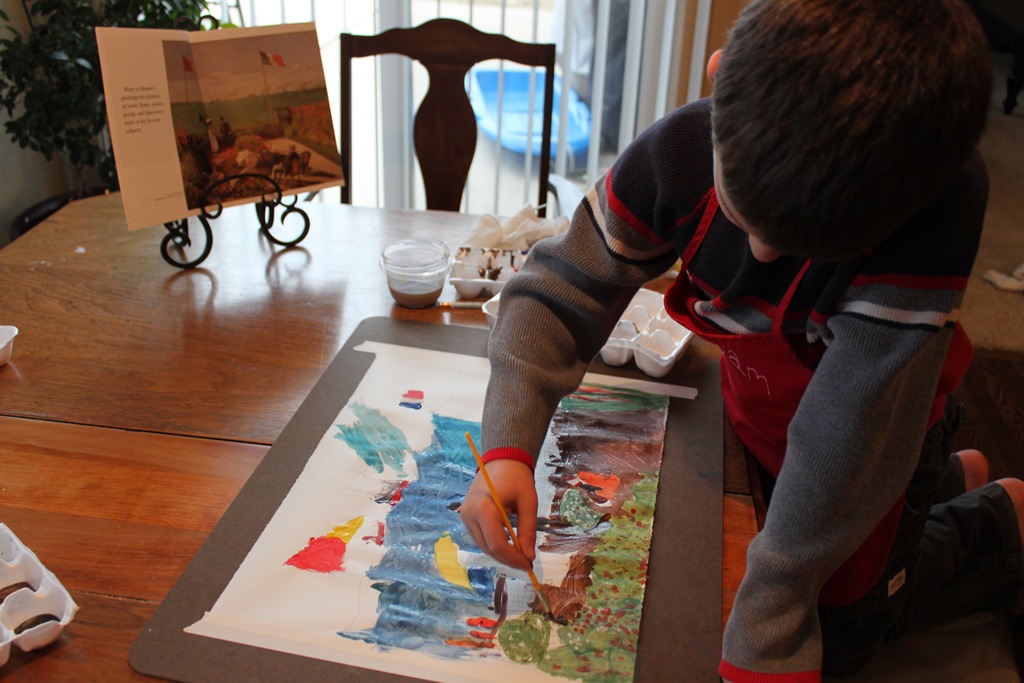 We took a few lessons and discussions to read through the Claude Monet World’s Greatest Artist series by Mike Venezia. We talked about all the different styles that he was known for, and took lots of time to familiarize ourselves with and critically assess his works of art.