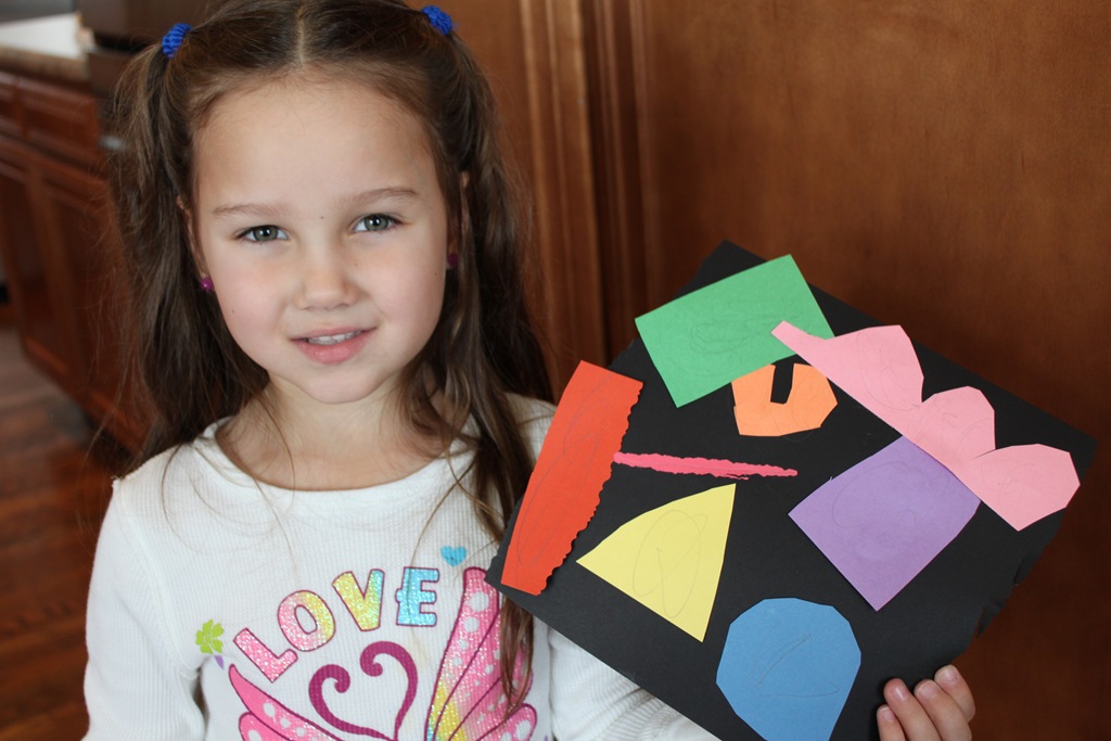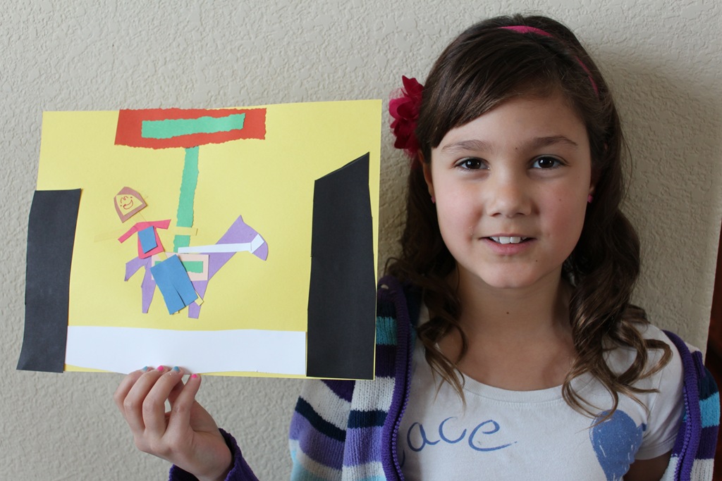 Next we tried a collage in honor of Matisse’s Sadness of the King. This was one of the harder things I think. Kids are used to trying to emulate what they see in real life, but to ask them to do something abstract was definitely a challenge as you’ll see based on our final pieces. I encouraged them to cut up random pieces of paper, then place them in a visually pleasing pattern on their paper.