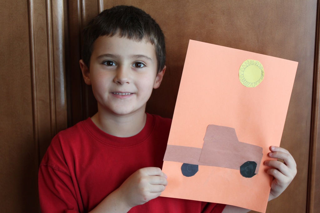 Here is what Turbo came up with. Trucks are visually pleasing to him. You probably can’t tell from the picture, but the truck is actually comprised of several smaller pieces of paper put together.