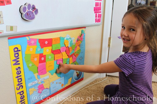 Here is my white board for the week, we use this to review all of the state facts and symbols each day. (Sorry for the glare, darn flash!)